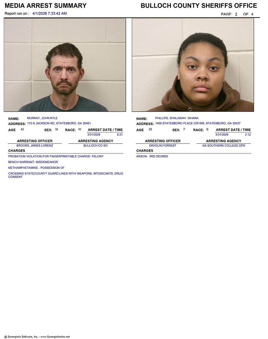 These records are matters of public information provided by the Bulloch County Sheriff’s Office. Booking reports are details of arrests only. All persons below are considered to be innocent unless proven otherwise in a court of law.