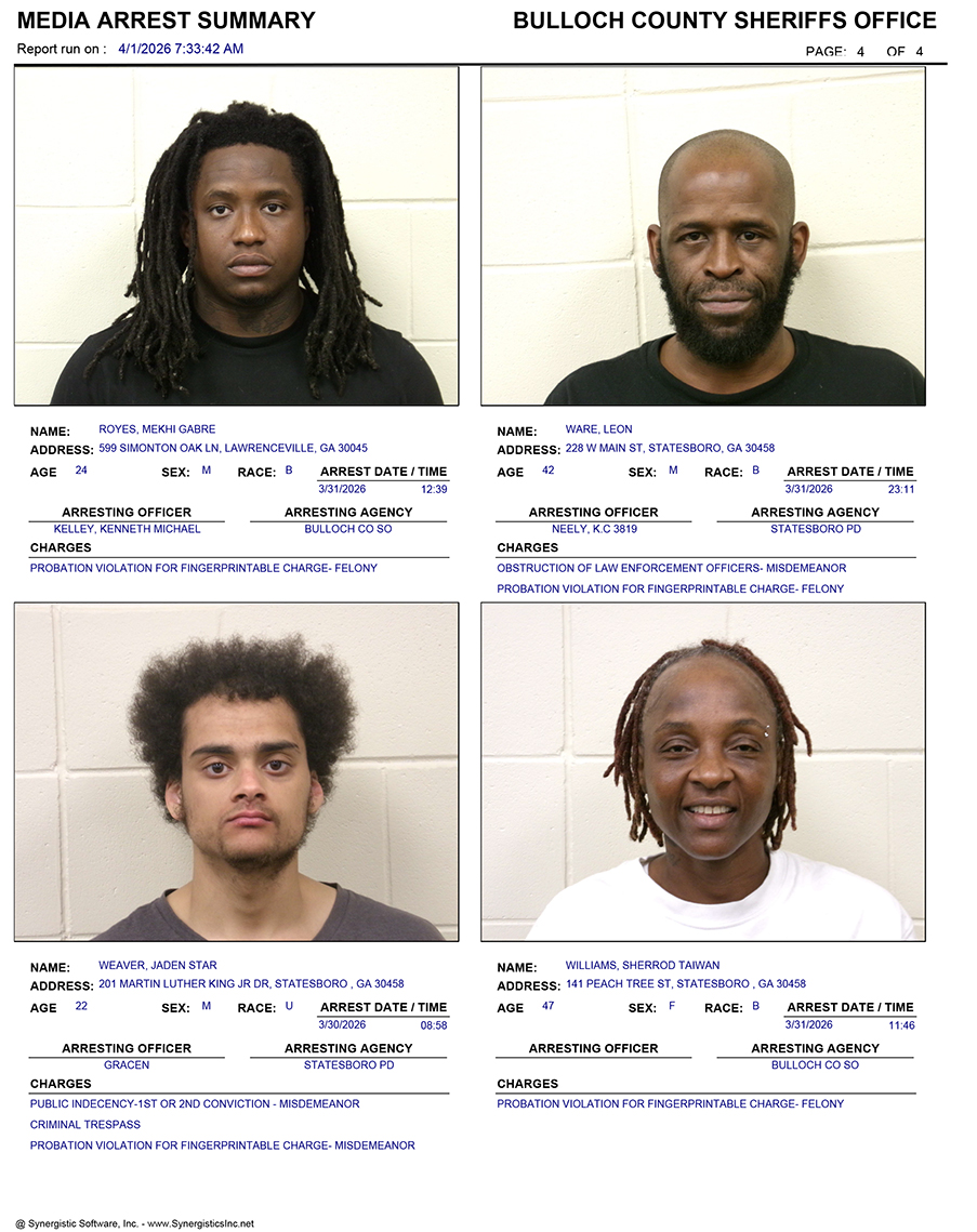 These records are matters of public information provided by the Bulloch County Sheriff’s Office. Booking reports are details of arrests only. All persons below are considered to be innocent unless proven otherwise in a court of law.