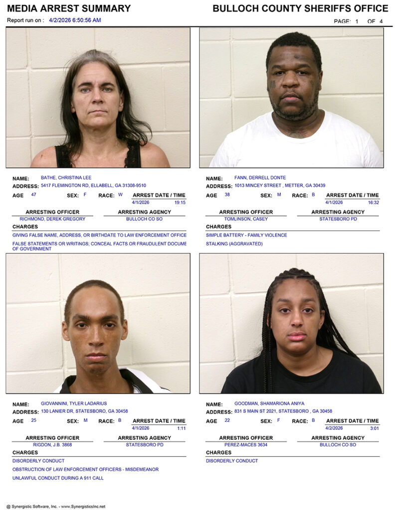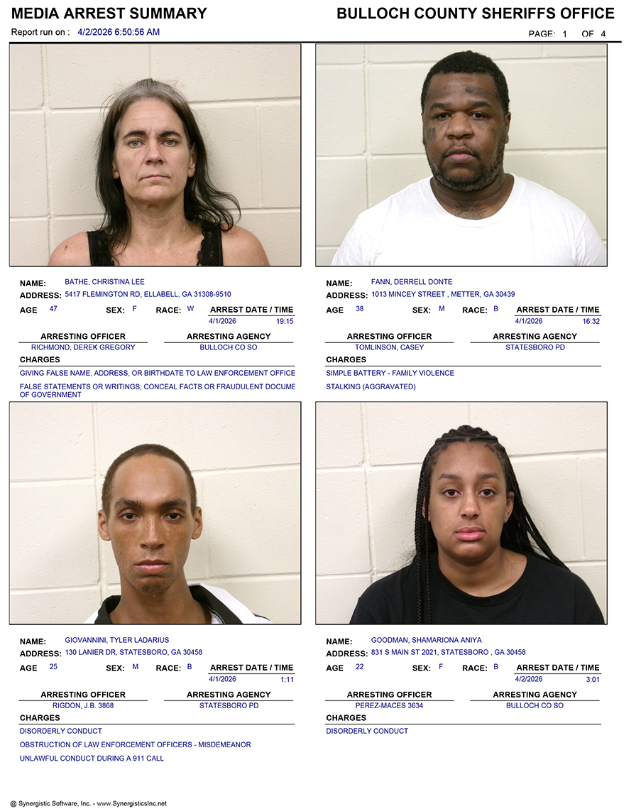 These records are matters of public information provided by the Bulloch County Sheriff’s Office. Booking reports are details of arrests only. All persons below are considered to be innocent unless proven otherwise in a court of law.