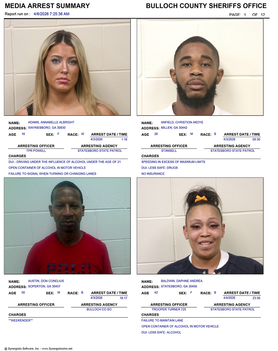 These records are matters of public information provided by the Bulloch County Sheriff’s Office. Booking reports are details of arrests only. All persons below are considered to be innocent unless proven otherwise in a court of law.
