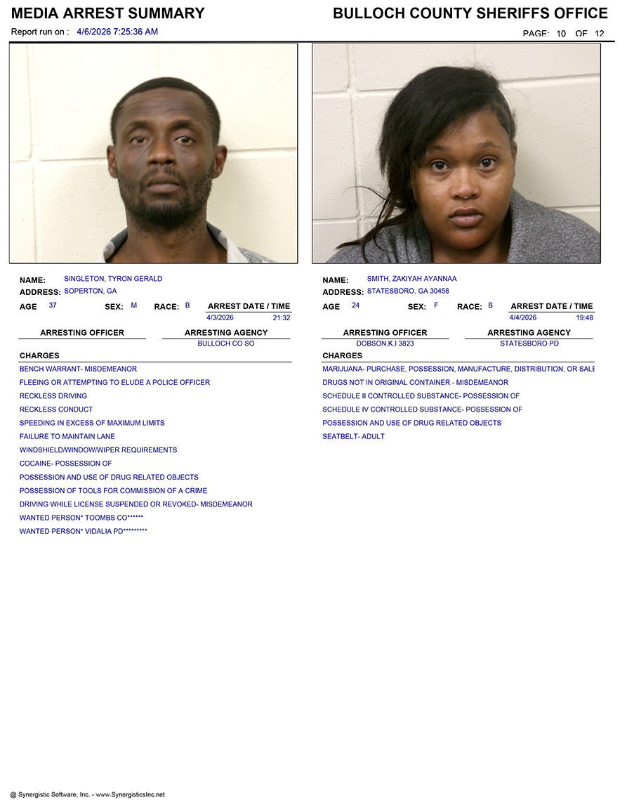 These records are matters of public information provided by the Bulloch County Sheriff’s Office. Booking reports are details of arrests only. All persons below are considered to be innocent unless proven otherwise in a court of law.