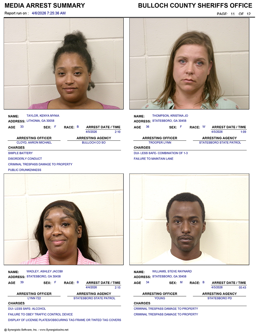 These records are matters of public information provided by the Bulloch County Sheriff’s Office. Booking reports are details of arrests only. All persons below are considered to be innocent unless proven otherwise in a court of law.