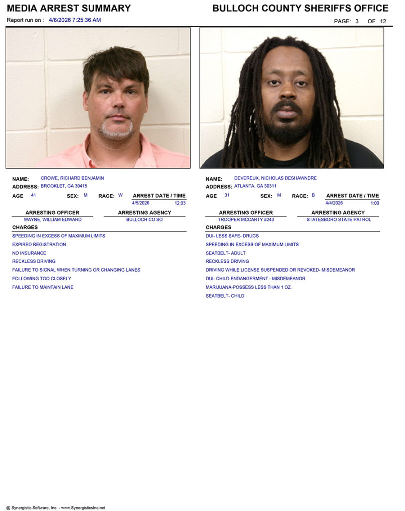 These records are matters of public information provided by the Bulloch County Sheriff’s Office. Booking reports are details of arrests only. All persons below are considered to be innocent unless proven otherwise in a court of law.