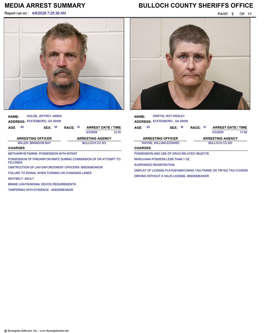 These records are matters of public information provided by the Bulloch County Sheriff’s Office. Booking reports are details of arrests only. All persons below are considered to be innocent unless proven otherwise in a court of law.