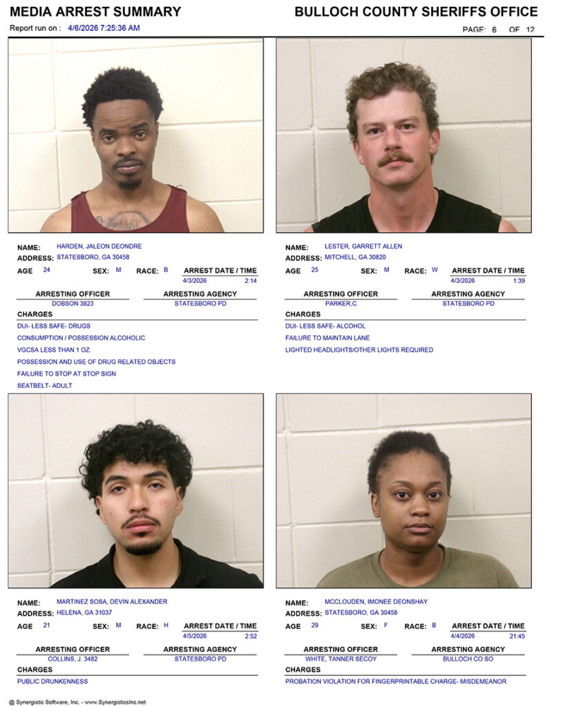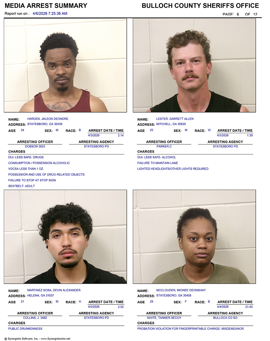 These records are matters of public information provided by the Bulloch County Sheriff’s Office. Booking reports are details of arrests only. All persons below are considered to be innocent unless proven otherwise in a court of law.