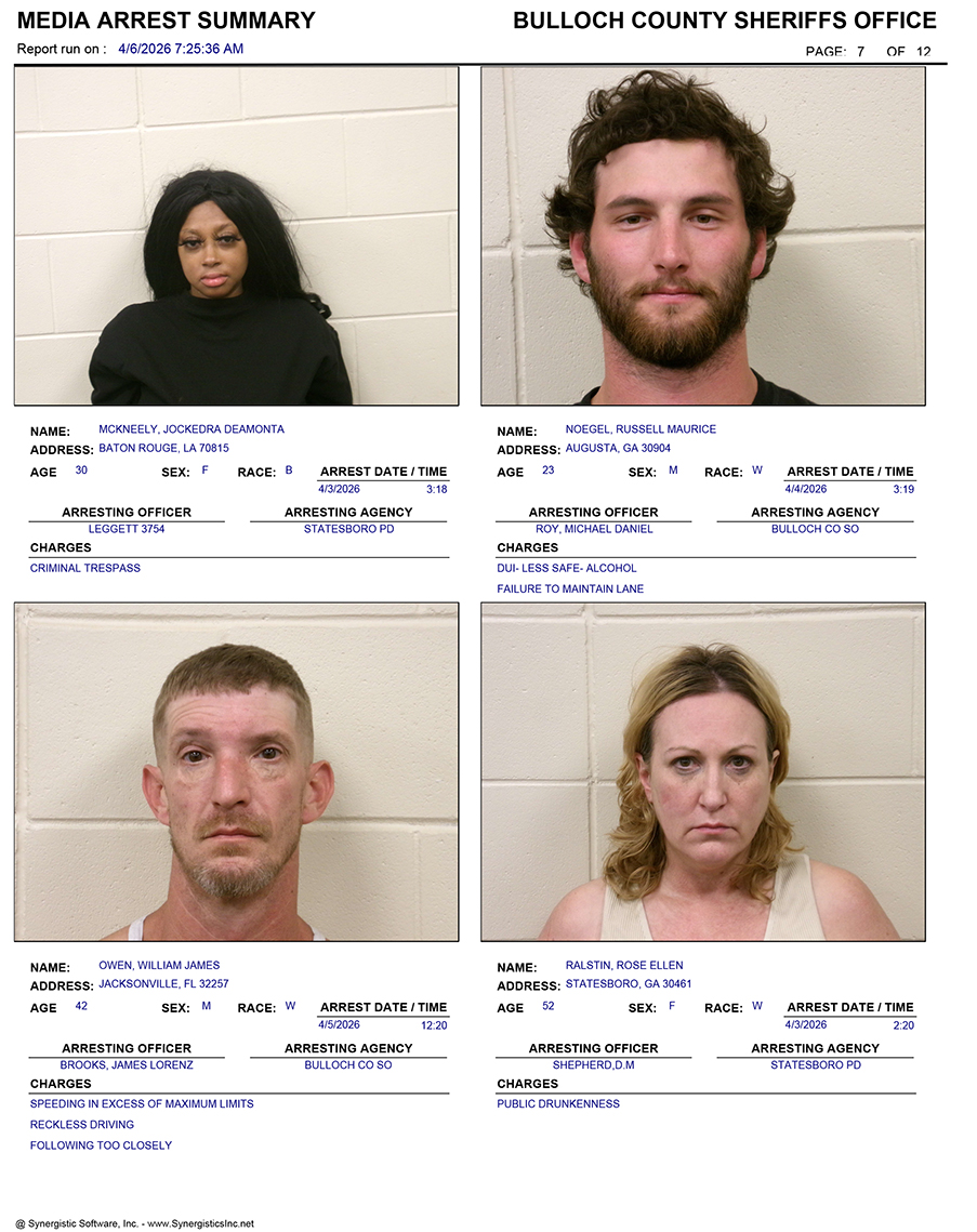 These records are matters of public information provided by the Bulloch County Sheriff’s Office. Booking reports are details of arrests only. All persons below are considered to be innocent unless proven otherwise in a court of law.