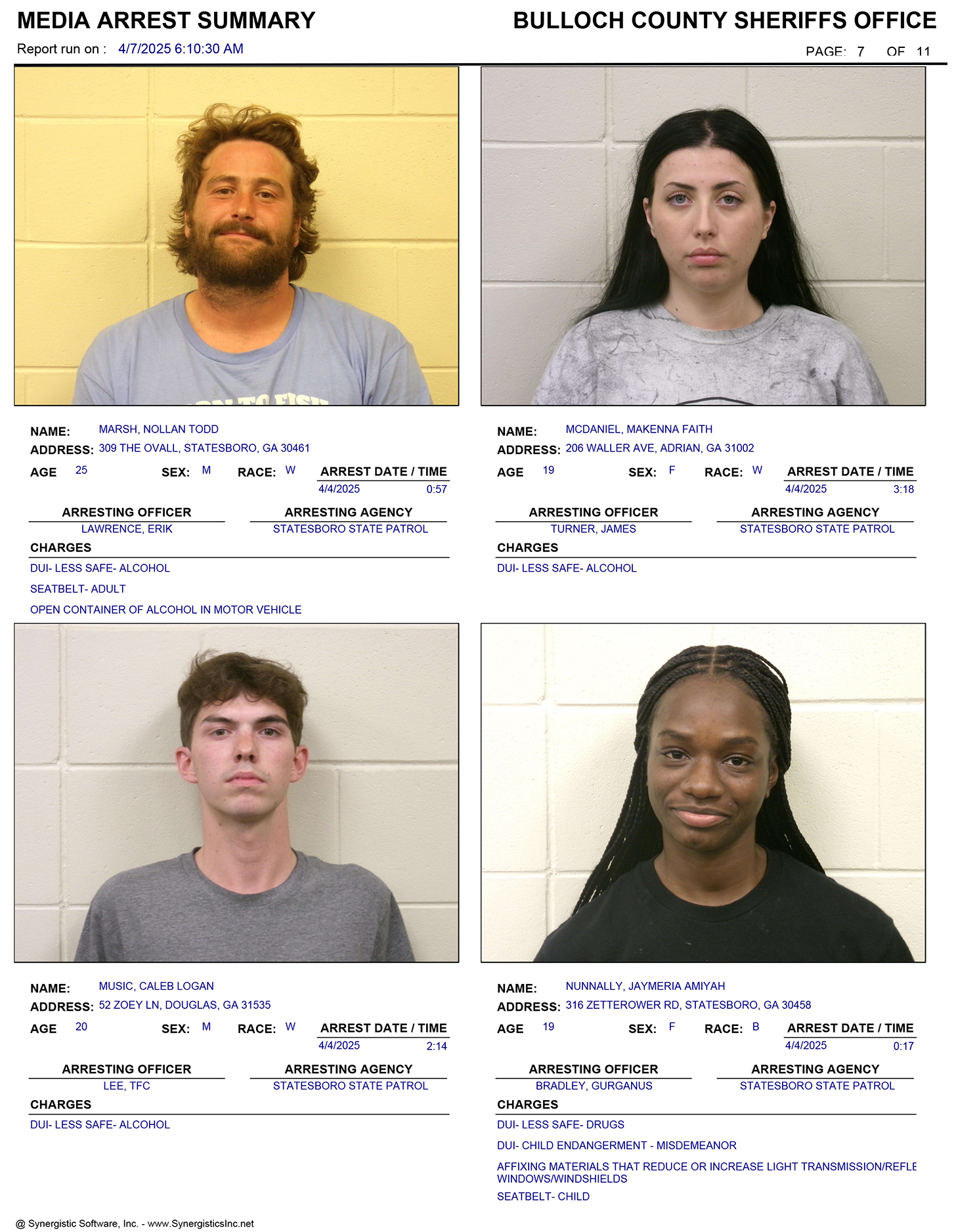 These records are matters of public information provided by the Bulloch County Sheriff’s Office. Booking reports are details of arrests only. All persons below are considered to be innocent unless proven otherwise in a court of law.