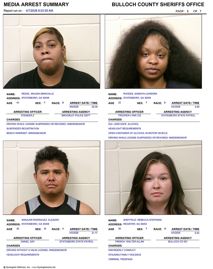 These records are matters of public information provided by the Bulloch County Sheriff’s Office. Booking reports are details of arrests only. All persons below are considered to be innocent unless proven otherwise in a court of law.