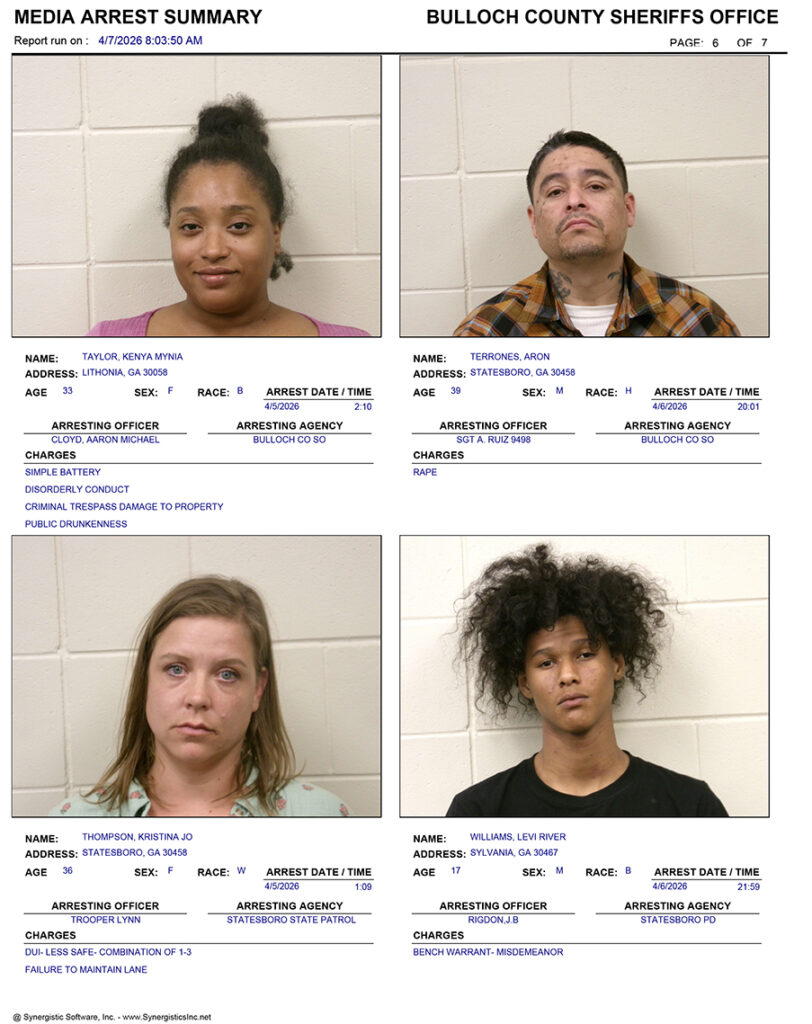 These records are matters of public information provided by the Bulloch County Sheriff’s Office. Booking reports are details of arrests only. All persons below are considered to be innocent unless proven otherwise in a court of law.