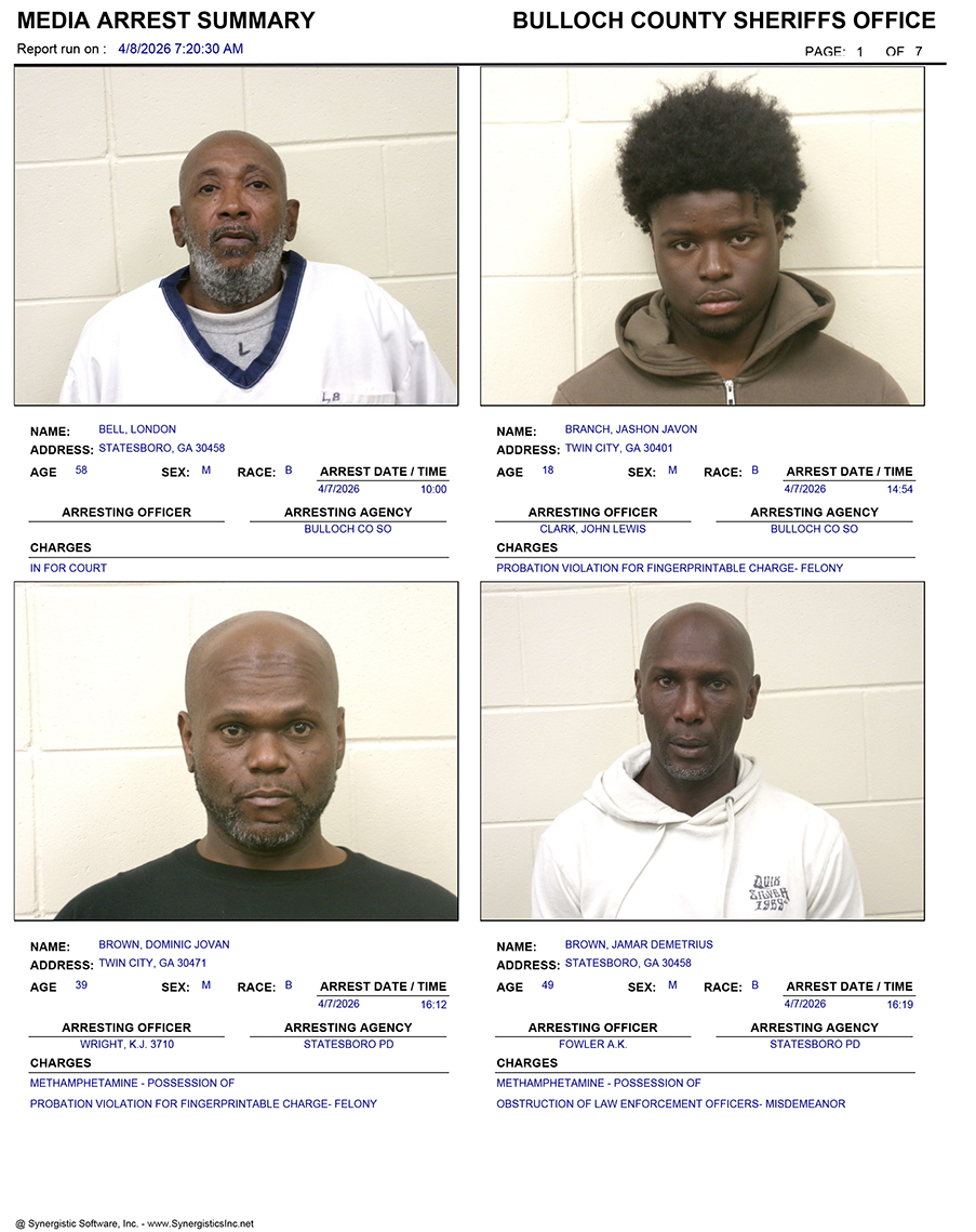 These records are matters of public information provided by the Bulloch County Sheriff’s Office. Booking reports are details of arrests only. All persons below are considered to be innocent unless proven otherwise in a court of law.