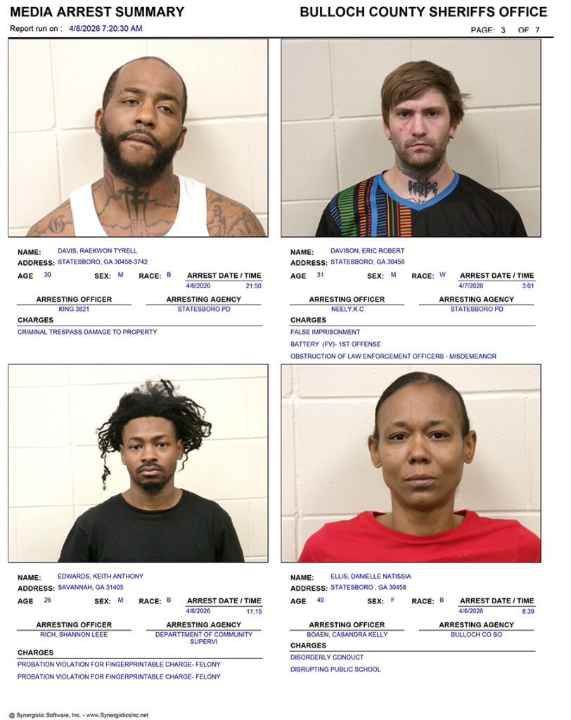 These records are matters of public information provided by the Bulloch County Sheriff’s Office. Booking reports are details of arrests only. All persons below are considered to be innocent unless proven otherwise in a court of law.