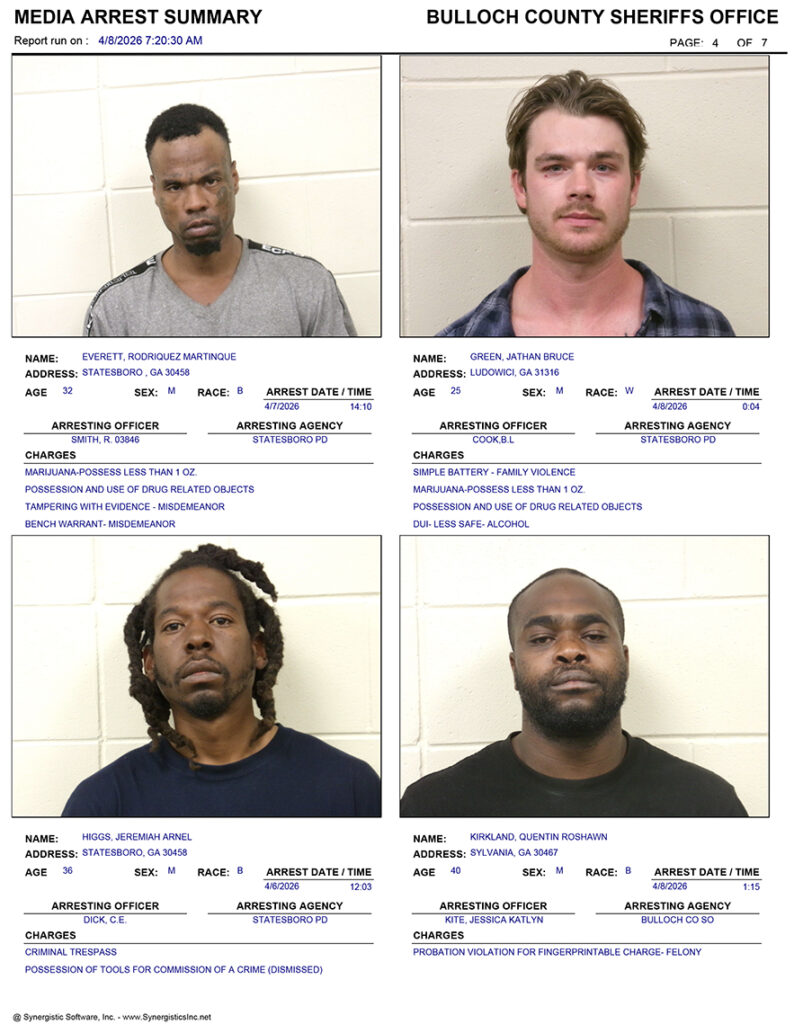 These records are matters of public information provided by the Bulloch County Sheriff’s Office. Booking reports are details of arrests only. All persons below are considered to be innocent unless proven otherwise in a court of law.