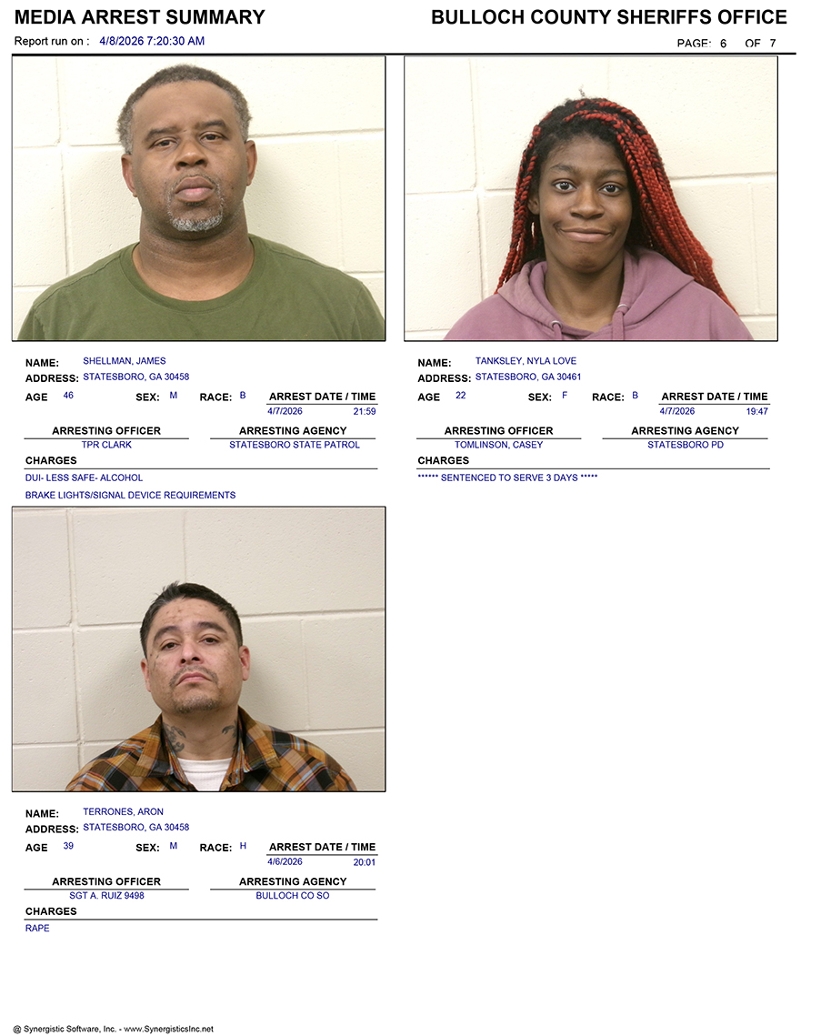 These records are matters of public information provided by the Bulloch County Sheriff’s Office. Booking reports are details of arrests only. All persons below are considered to be innocent unless proven otherwise in a court of law.