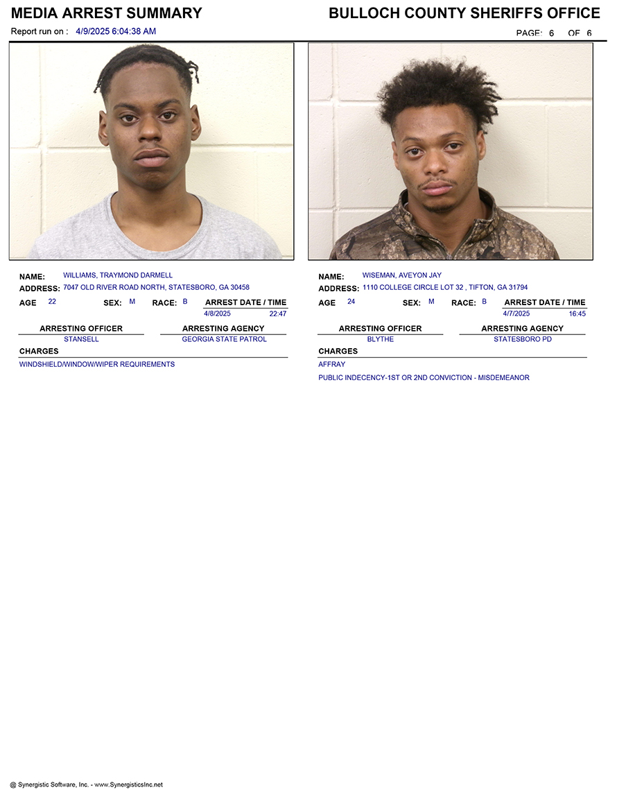 These records are matters of public information provided by the Bulloch County Sheriff’s Office. Booking reports are details of arrests only. All persons below are considered to be innocent unless proven otherwise in a court of law.