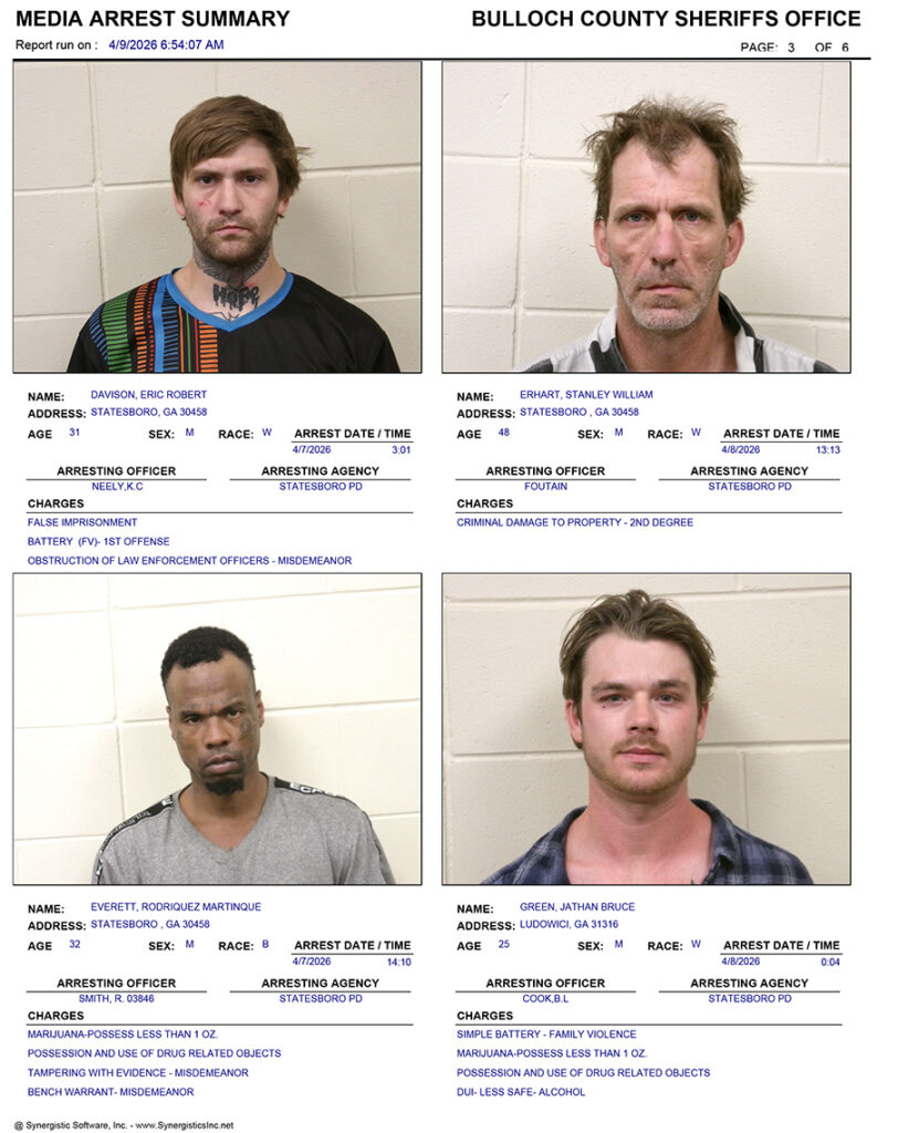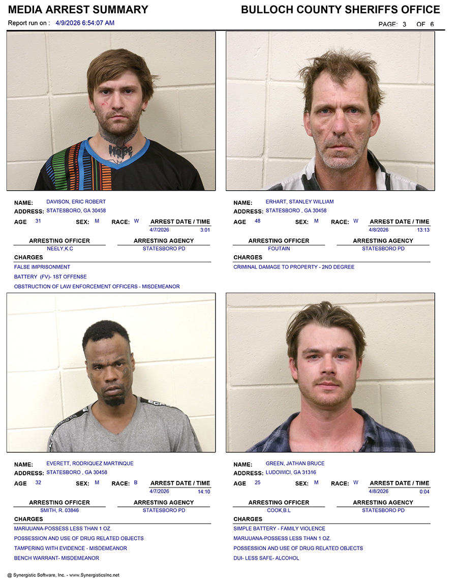 These records are matters of public information provided by the Bulloch County Sheriff’s Office. Booking reports are details of arrests only. All persons below are considered to be innocent unless proven otherwise in a court of law.