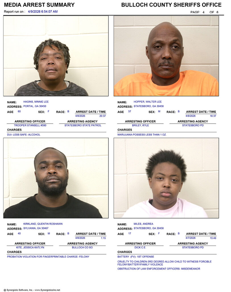 These records are matters of public information provided by the Bulloch County Sheriff’s Office. Booking reports are details of arrests only. All persons below are considered to be innocent unless proven otherwise in a court of law.