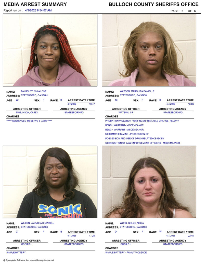 These records are matters of public information provided by the Bulloch County Sheriff’s Office. Booking reports are details of arrests only. All persons below are considered to be innocent unless proven otherwise in a court of law.