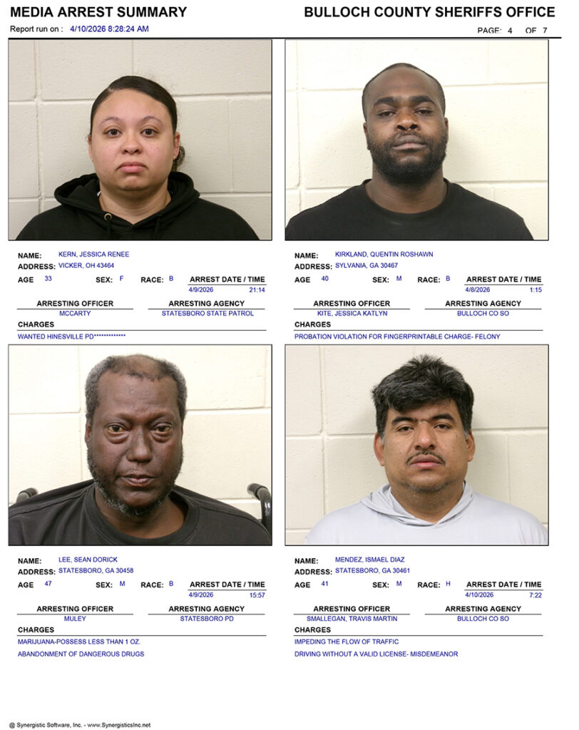 These records are matters of public information provided by the Bulloch County Sheriff’s Office. Booking reports are details of arrests only. All persons below are considered to be innocent unless proven otherwise in a court of law.