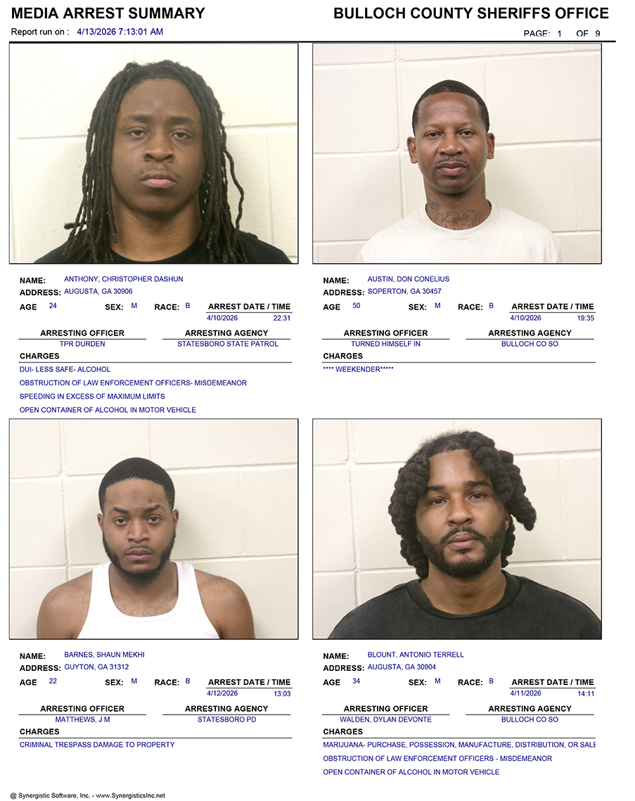 These records are matters of public information provided by the Bulloch County Sheriff’s Office. Booking reports are details of arrests only. All persons below are considered to be innocent unless proven otherwise in a court of law.