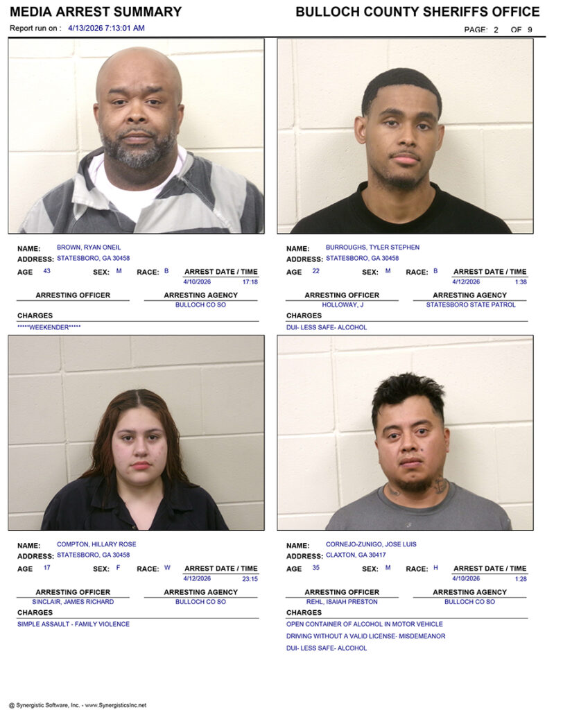 These records are matters of public information provided by the Bulloch County Sheriff’s Office. Booking reports are details of arrests only. All persons below are considered to be innocent unless proven otherwise in a court of law.
