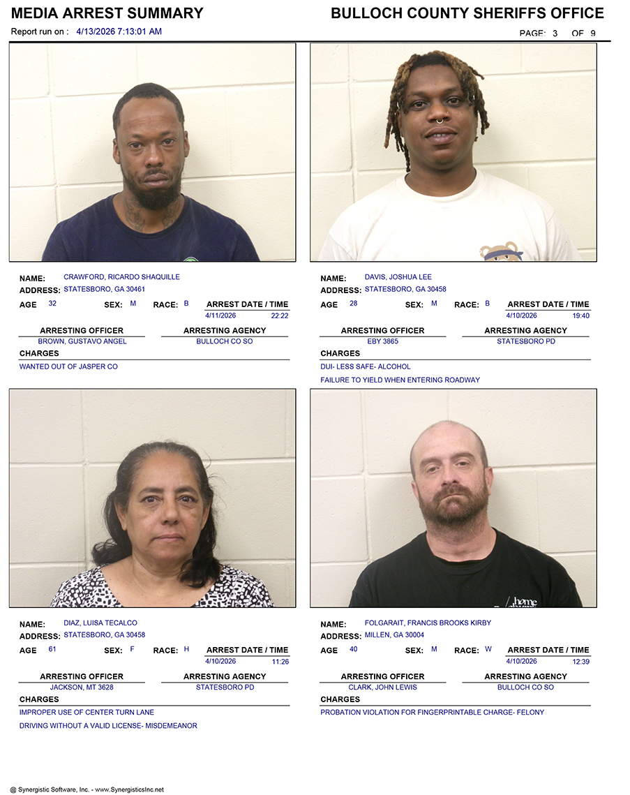 These records are matters of public information provided by the Bulloch County Sheriff’s Office. Booking reports are details of arrests only. All persons below are considered to be innocent unless proven otherwise in a court of law.