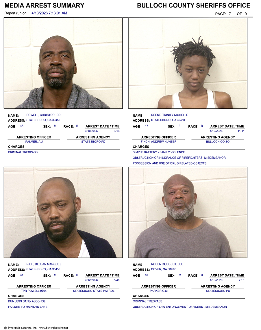 These records are matters of public information provided by the Bulloch County Sheriff’s Office. Booking reports are details of arrests only. All persons below are considered to be innocent unless proven otherwise in a court of law.