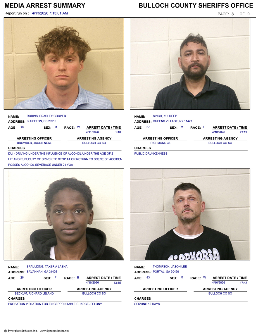 These records are matters of public information provided by the Bulloch County Sheriff’s Office. Booking reports are details of arrests only. All persons below are considered to be innocent unless proven otherwise in a court of law.