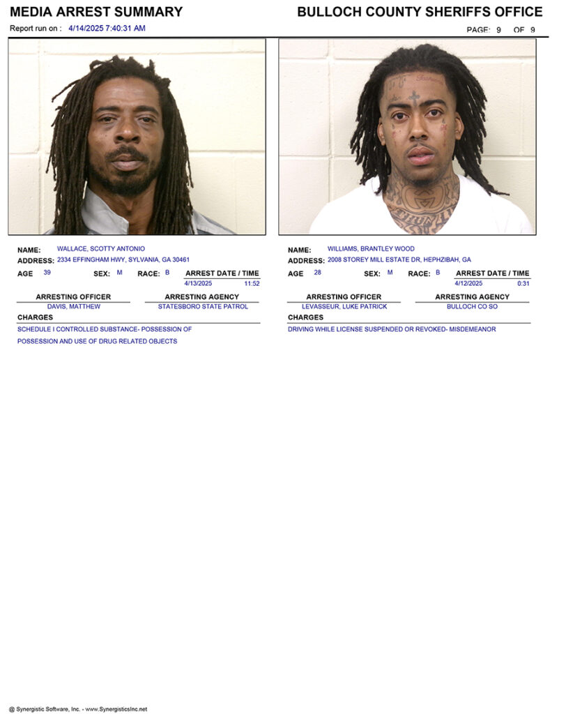 These records are matters of public information provided by the Bulloch County Sheriff’s Office. Booking reports are details of arrests only. All persons below are considered to be innocent unless proven otherwise in a court of law.