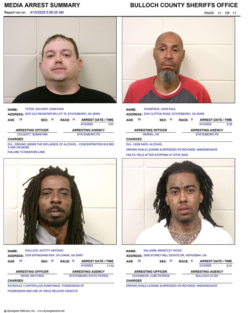 These records are matters of public information provided by the Bulloch County Sheriff’s Office. Booking reports are details of arrests only. All persons below are considered to be innocent unless proven otherwise in a court of law.