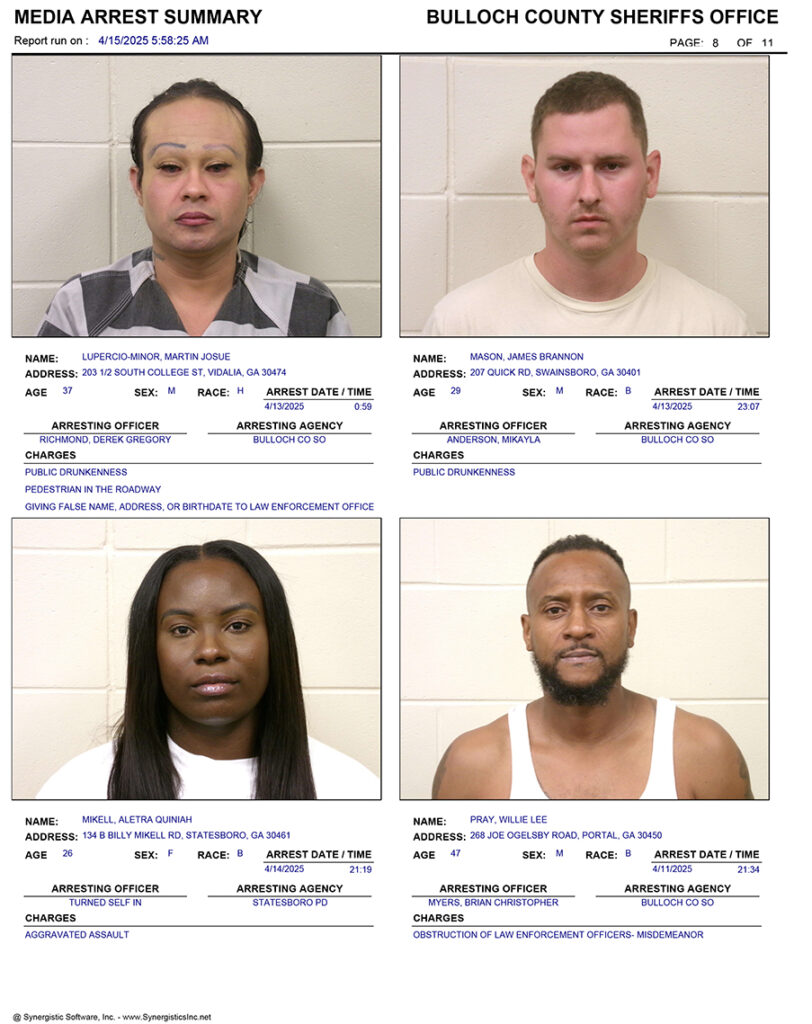 These records are matters of public information provided by the Bulloch County Sheriff’s Office. Booking reports are details of arrests only. All persons below are considered to be innocent unless proven otherwise in a court of law.