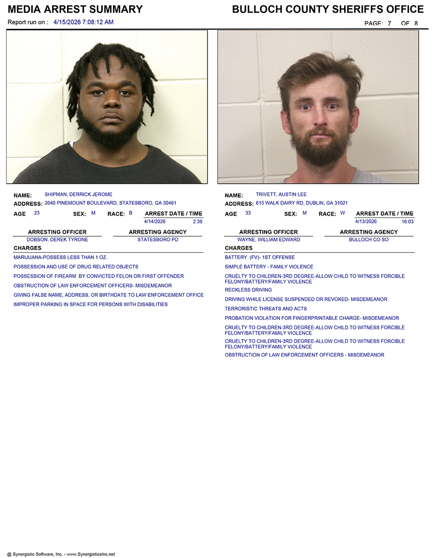 These records are matters of public information provided by the Bulloch County Sheriff’s Office. Booking reports are details of arrests only. All persons below are considered to be innocent unless proven otherwise in a court of law.