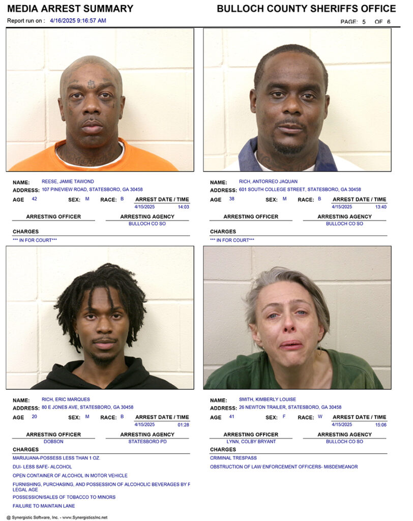 These records are matters of public information provided by the Bulloch County Sheriff’s Office. Booking reports are details of arrests only. All persons below are considered to be innocent unless proven otherwise in a court of law.