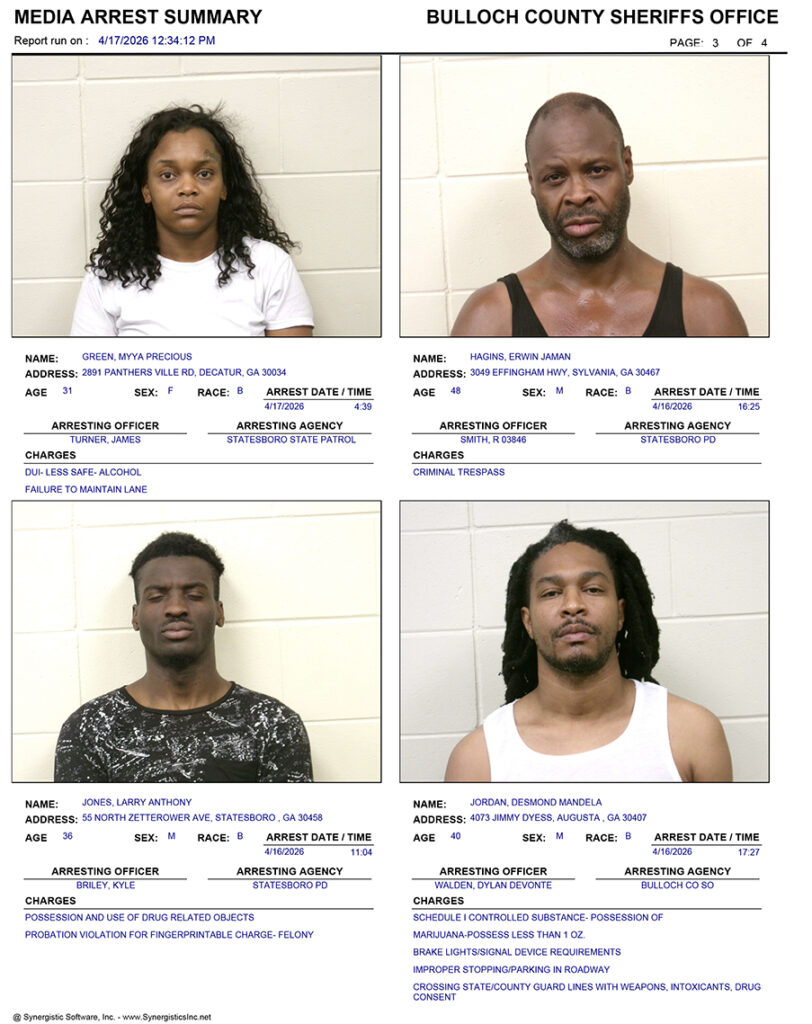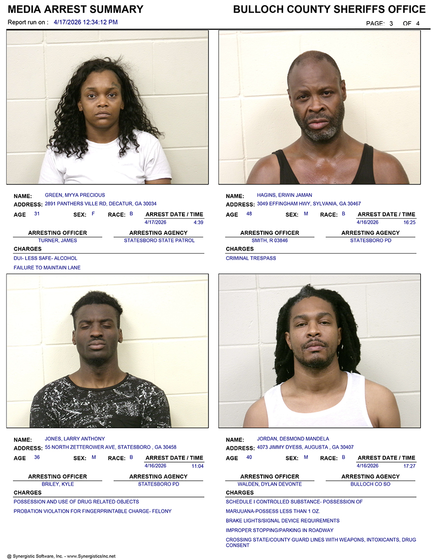 These records are matters of public information provided by the Bulloch County Sheriff’s Office. Booking reports are details of arrests only. All persons below are considered to be innocent unless proven otherwise in a court of law.