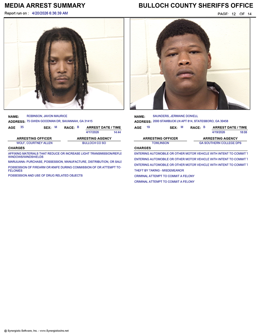 These records are matters of public information provided by the Bulloch County Sheriff’s Office. Booking reports are details of arrests only. All persons below are considered to be innocent unless proven otherwise in a court of law.