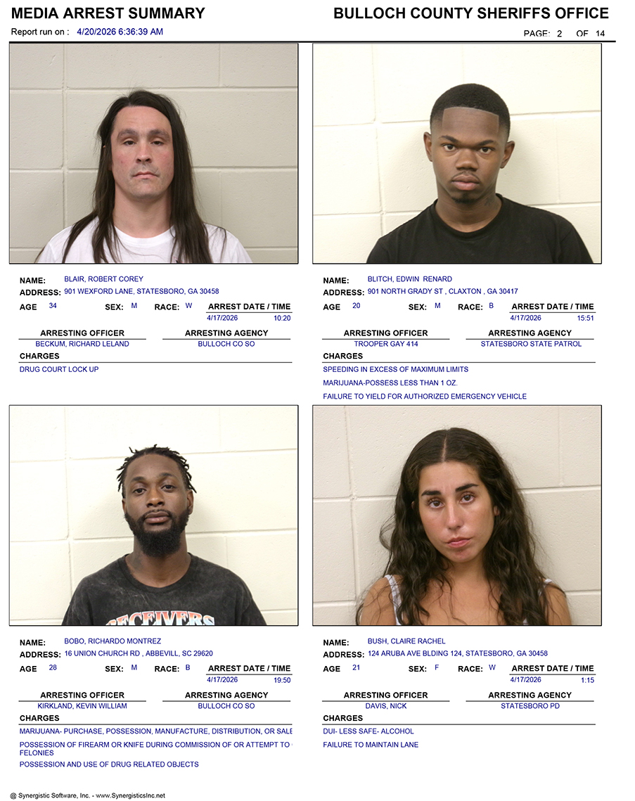 These records are matters of public information provided by the Bulloch County Sheriff’s Office. Booking reports are details of arrests only. All persons below are considered to be innocent unless proven otherwise in a court of law.