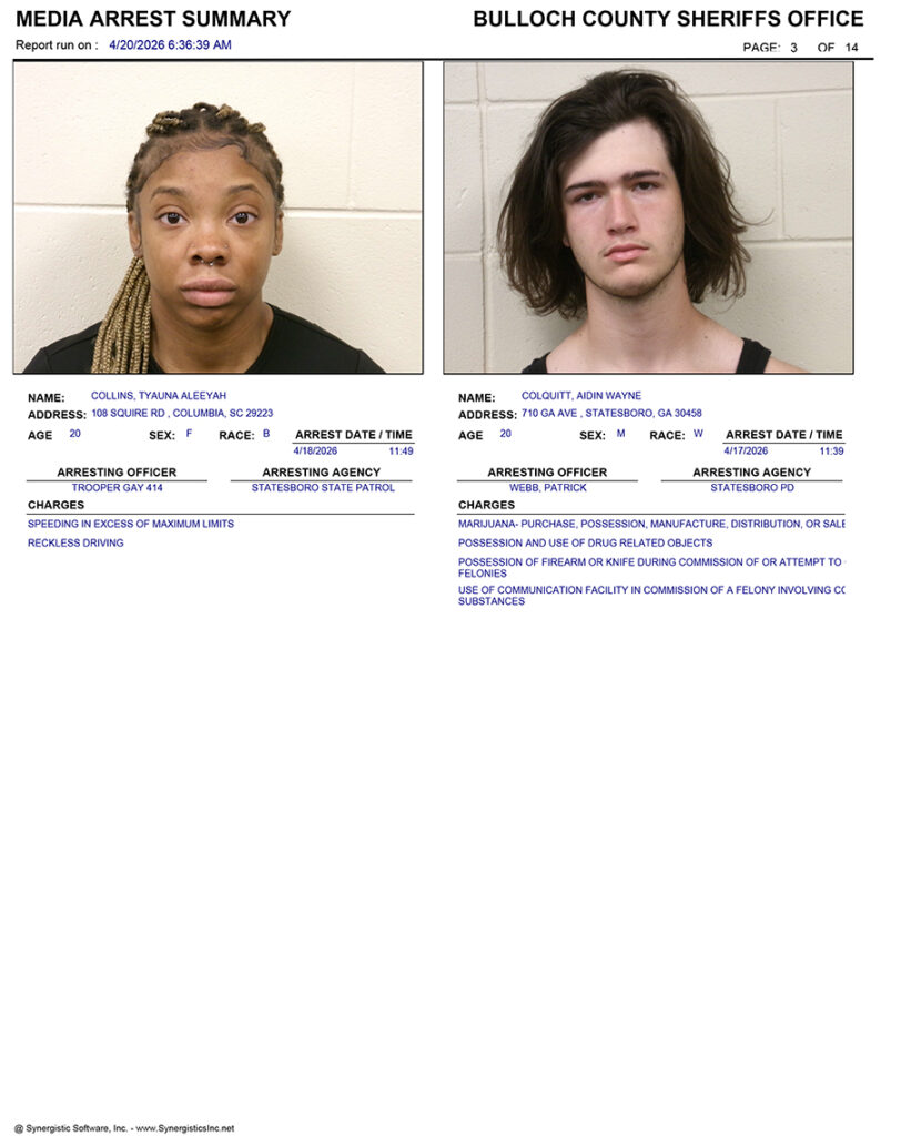 These records are matters of public information provided by the Bulloch County Sheriff’s Office. Booking reports are details of arrests only. All persons below are considered to be innocent unless proven otherwise in a court of law.