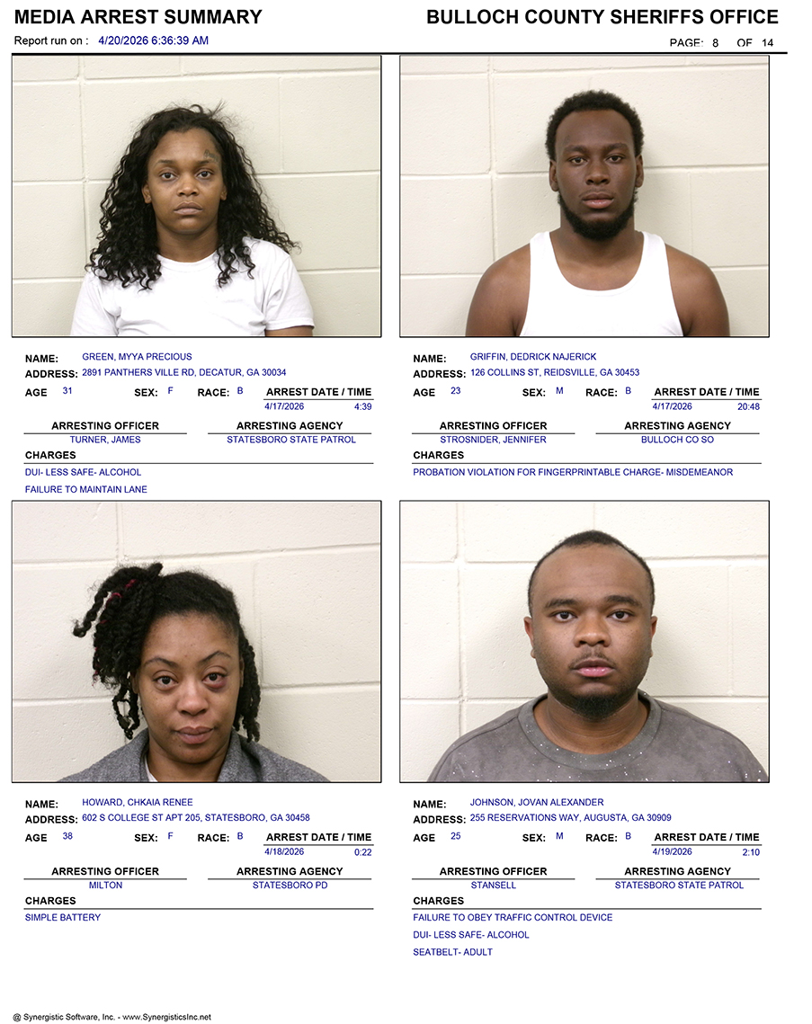 These records are matters of public information provided by the Bulloch County Sheriff’s Office. Booking reports are details of arrests only. All persons below are considered to be innocent unless proven otherwise in a court of law.