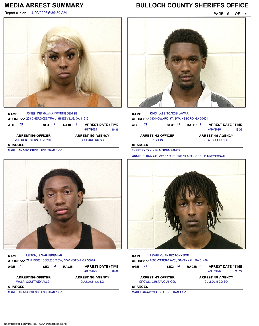 These records are matters of public information provided by the Bulloch County Sheriff’s Office. Booking reports are details of arrests only. All persons below are considered to be innocent unless proven otherwise in a court of law.