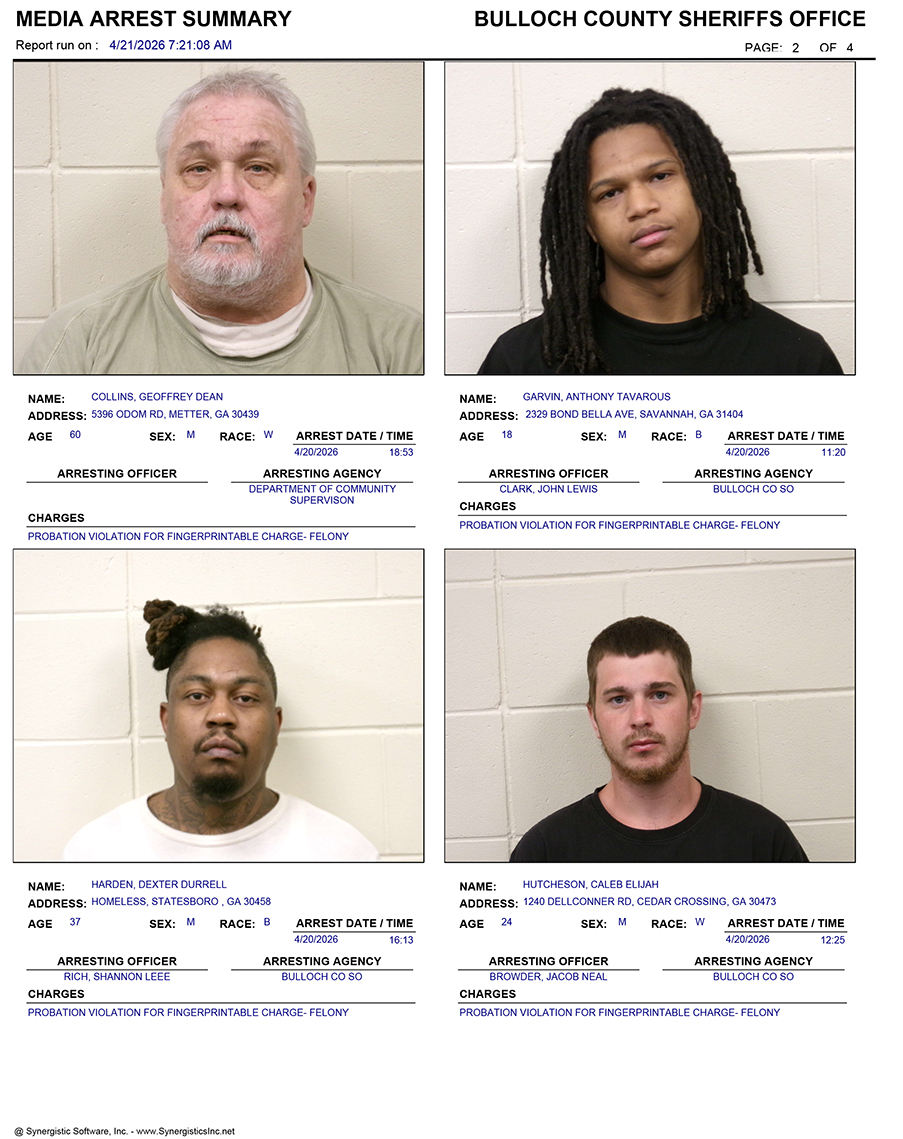 These records are matters of public information provided by the Bulloch County Sheriff’s Office. Booking reports are details of arrests only. All persons below are considered to be innocent unless proven otherwise in a court of law.