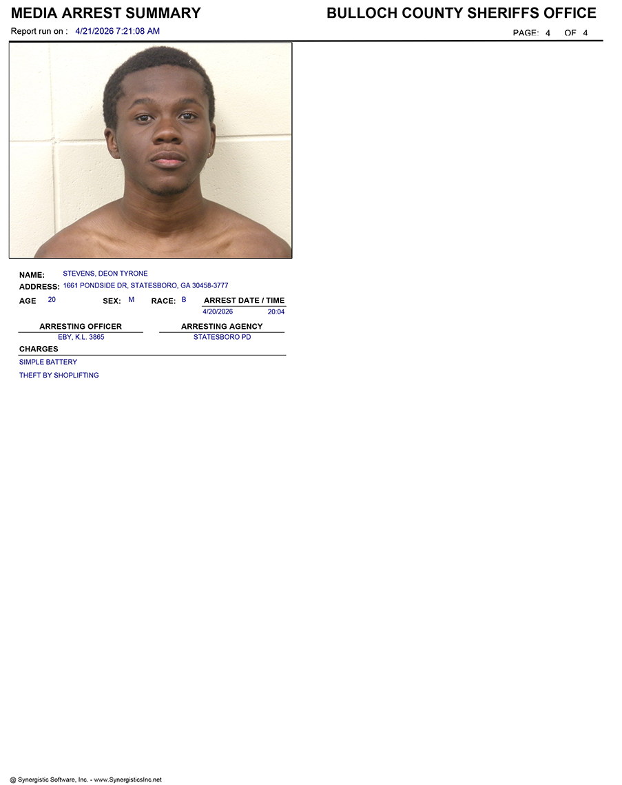 These records are matters of public information provided by the Bulloch County Sheriff’s Office. Booking reports are details of arrests only. All persons below are considered to be innocent unless proven otherwise in a court of law.