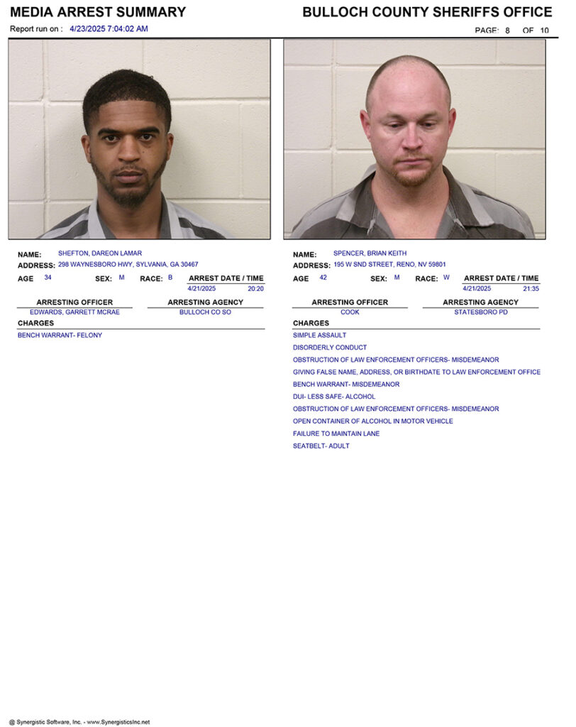 These records are matters of public information provided by the Bulloch County Sheriff’s Office. Booking reports are details of arrests only. All persons below are considered to be innocent unless proven otherwise in a court of law.