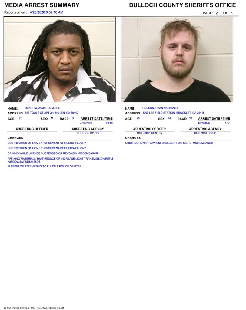 These records are matters of public information provided by the Bulloch County Sheriff’s Office. Booking reports are details of arrests only. All persons below are considered to be innocent unless proven otherwise in a court of law.