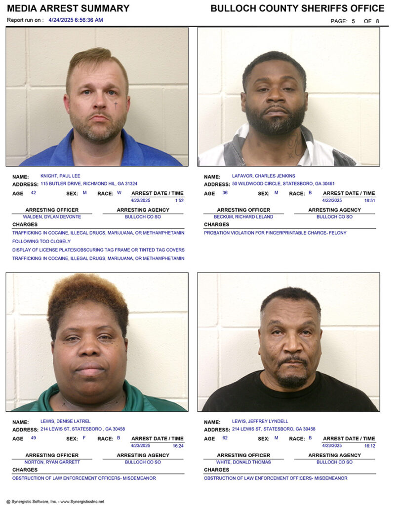 These records are matters of public information provided by the Bulloch County Sheriff’s Office. Booking reports are details of arrests only. All persons below are considered to be innocent unless proven otherwise in a court of law.