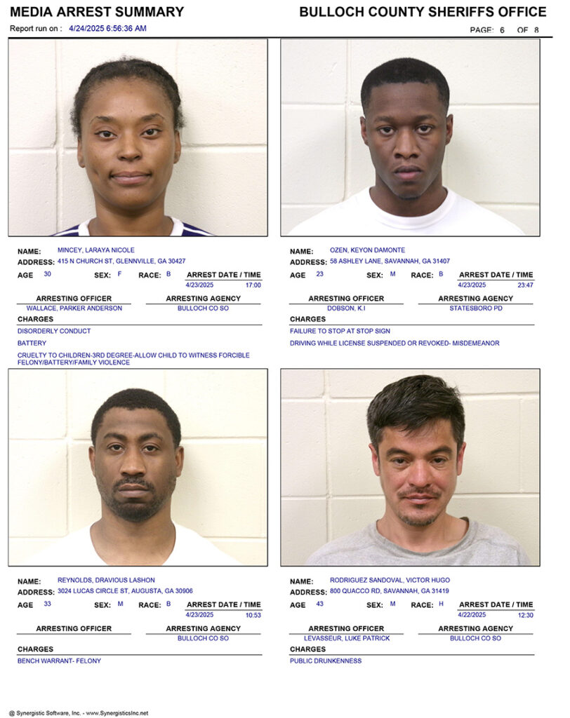 These records are matters of public information provided by the Bulloch County Sheriff’s Office. Booking reports are details of arrests only. All persons below are considered to be innocent unless proven otherwise in a court of law.