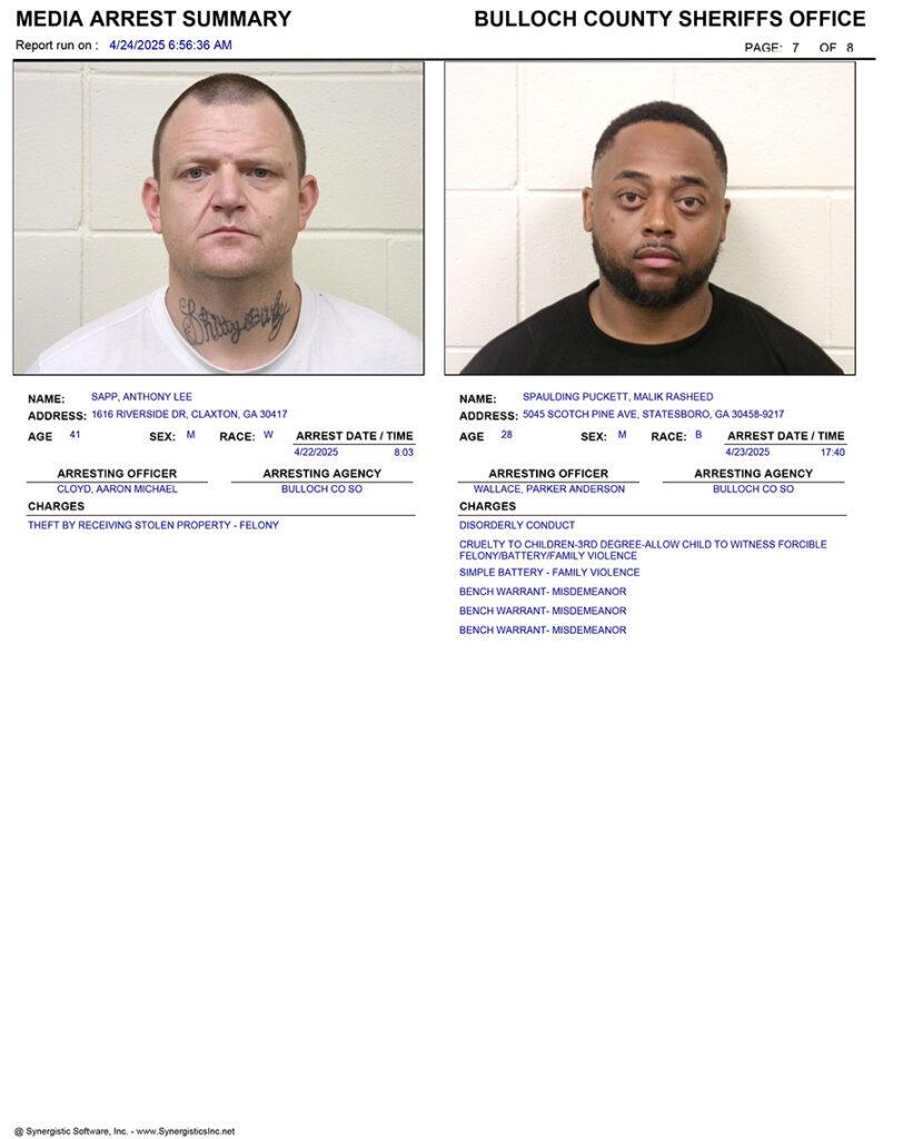 These records are matters of public information provided by the Bulloch County Sheriff’s Office. Booking reports are details of arrests only. All persons below are considered to be innocent unless proven otherwise in a court of law.