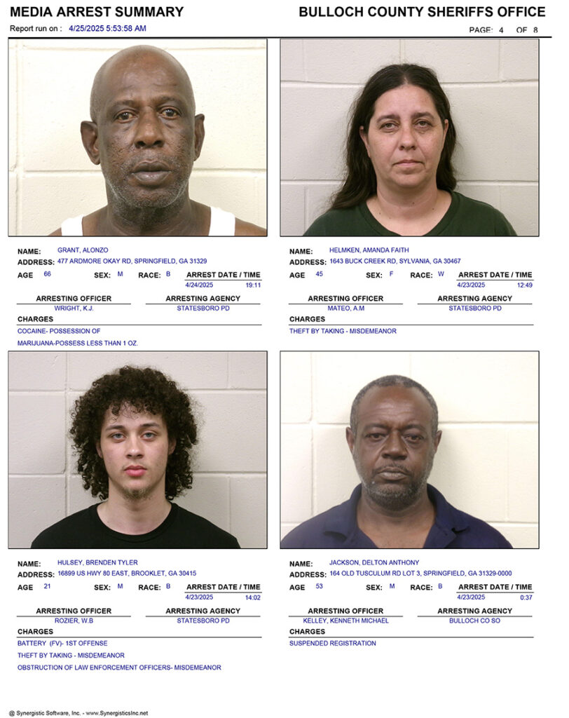 These records are matters of public information provided by the Bulloch County Sheriff’s Office. Booking reports are details of arrests only. All persons below are considered to be innocent unless proven otherwise in a court of law.