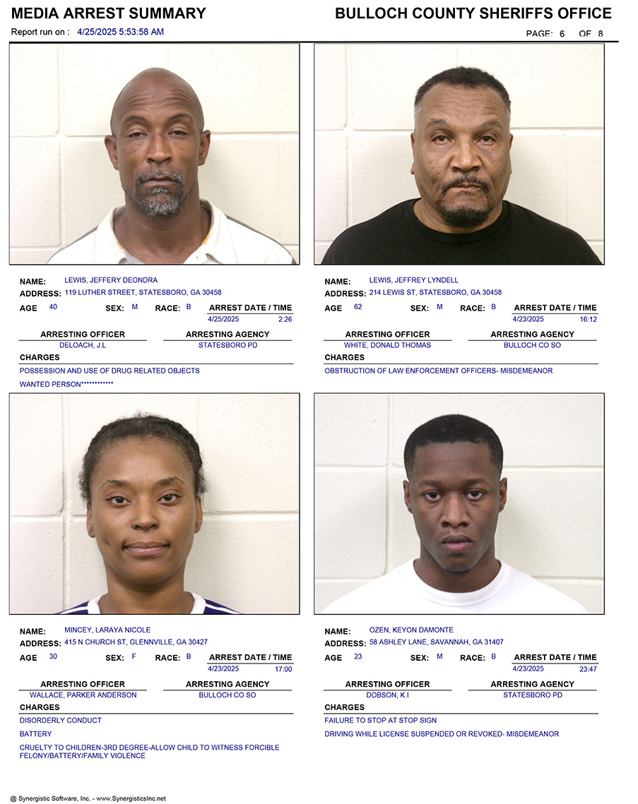 These records are matters of public information provided by the Bulloch County Sheriff’s Office. Booking reports are details of arrests only. All persons below are considered to be innocent unless proven otherwise in a court of law.