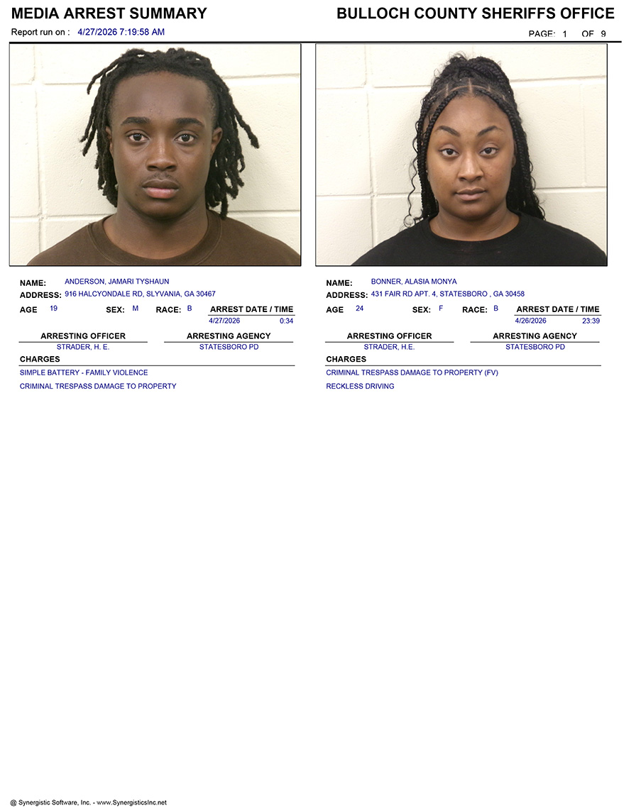 These records are matters of public information provided by the Bulloch County Sheriff’s Office. Booking reports are details of arrests only. All persons below are considered to be innocent unless proven otherwise in a court of law.