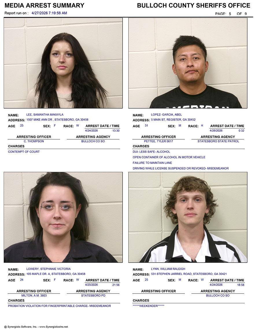 These records are matters of public information provided by the Bulloch County Sheriff’s Office. Booking reports are details of arrests only. All persons below are considered to be innocent unless proven otherwise in a court of law.