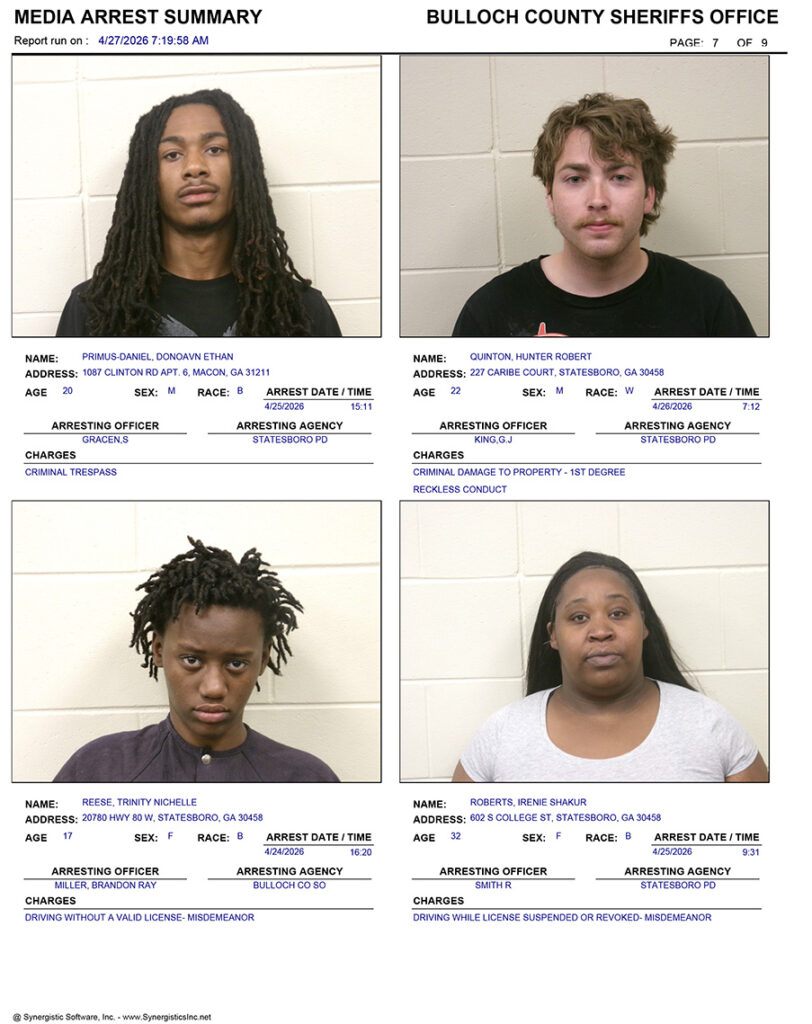 These records are matters of public information provided by the Bulloch County Sheriff’s Office. Booking reports are details of arrests only. All persons below are considered to be innocent unless proven otherwise in a court of law.